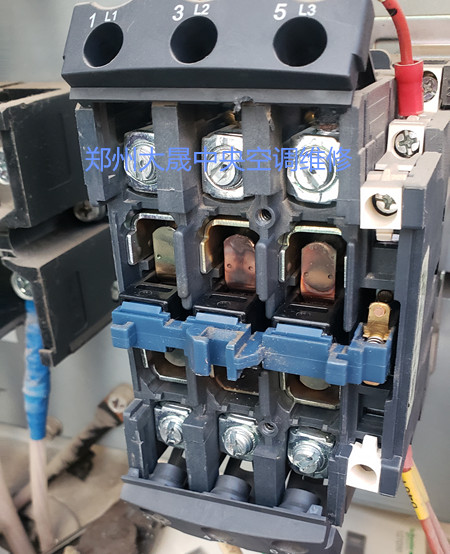 鄭州空調維修師傅上門檢測發現有臺主機電流非常大,測量壓縮機阻值和絕緣都是正常的,但是壓縮機啟動電流就是特別大,檢測壓縮機電壓交流接觸器進線電壓正常,而交流接觸器輸出只有2項有電壓。初步斷定交流接觸器觸點有問題,